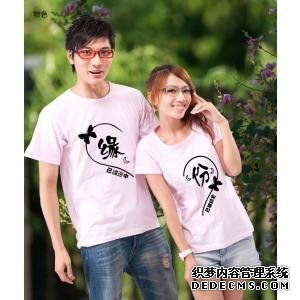 情侣装定做关键就是色彩的选择,粉红色看似只适合女生穿着的颜色,其实男生穿着也是非常好的呢?看我们下面这套情侣T恤就是见证。你缘我份的,正是恋人之间的最爱。款式的选择一般都是根据男生来选择,一般都需要选择比较适宜的那样穿出来才好看,很多MM们都有着很多的图案选择,但是男生就不一样了,所以一般都在于男生的。还有面料的选择,这样的T恤最好能够穿得更长久,那么你们的感情也会月长久,所以定做情侣装最好要定做质量好的t恤,所以让你们的缘份一直延续下去吧!